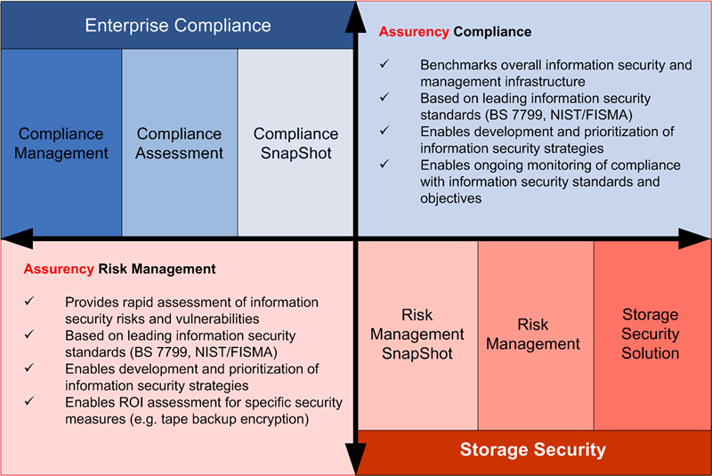 Assurency Risk Management is a comprehensive service that enables to customers to directly and immediately assess the risks, threats, vulnerabilities and ROI associated with specific data storage infrastructure components such as archival and backup and in-line data storage. The results are used to help develop and prioritize specific security strategies.