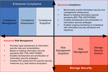 The Assurency® Storage Security Compliance Audit Service enables organizations to rapidly assess the compliance of their storage infrastructure with privacy and corporate governance legislation such as SOX, SEC 17A-4, California Senate Bill 1386, PIPEDA, GLBA and HIPAA. The service evaluates and prioritizes compliance risks and control gaps to reduce risk, identify corrective action and improve compliance-readiness.